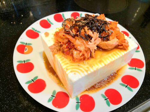 豆腐にツナとキムチと塩昆布のせてごま油+ポン酢でさっぱりコク旨な冷奴に。 お豆腐は絹ごしで冷たくひやして。 ツナはノンオイル。業務用の袋で買って冷凍ストックもあり。 塩昆布+ごま油+ポン酢の旨味の相乗効果で美味しくタンパク質をゲット。 お豆腐…