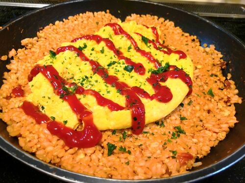 フライパンごと食卓にだすお焦げ付き半熟たんぽぽオムライス ケチャップライスはミートソース入りで旨味たっぷり、フライパンで仕上げに焼き付けてお焦げを作ると香ばしい。 グラスフェッドバターをたっぷり使ってコクと香りをプラス。 もち麦ごはんで食物繊…