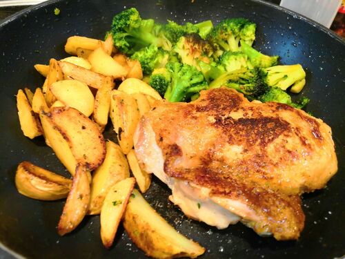皮からパリッと焼いた鶏もも肉から滲み出る脂でポテトとブロッコリーも焼く。 鶏もも肉は皮をパリパリになるようにしっかりこんがり焼くと香ばしい。 鶏もも肉の皮から出る脂でポテトとブロッコリーも美味しく焼ける。 味付けはシンプルに塩コショウだけ。 …