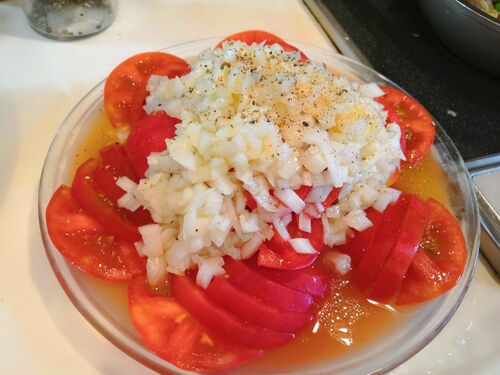 カットしたトマトに新玉ねぎたっぷりドレッシングでさっぱりサラダ。 新玉ねぎはMCTオイル入りドレッシングと混ぜるだけ。 カットしたトマトにドレッシングをかけて黒胡椒でスパイシーに。 こってり料理にぴったりあうさっぱりサラダ。 野菜高騰でもトマトだ…