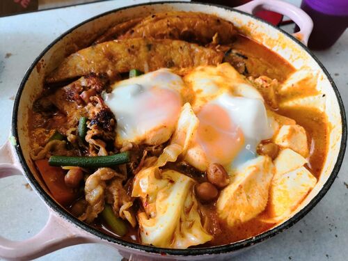 和風の煮物をキムチ味に上書きする栄養たっぷりリメイク鍋。 豚こま、キムチを炒めて煮物残り、チーズダッカルビ残りを加えて煮込むだけ。 キャベツたっぷり、にんにくの芽も追加してスタミナ。 豆腐と卵を加えてタンパク質もしっかり栄養豊富なキムチ鍋。 …
