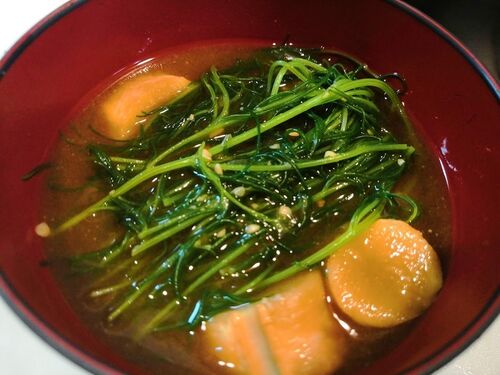 お麩とシャキシャキ半生おかひじきのお味噌汁。 おかひじきは仕上げに加えて半生シャキシャキの歯ごたえを味わう。 お麩は水につけて絞って加える。 味噌は八丁味噌と信州味噌のミックス合わせ味噌で風味と旨味の相乗効果。 お麩&おかひじき味噌汁。八丁味噌…