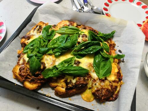 卵入りミートソースのピザトーストは見た目以上に意外とヘルシー。 ミートソースは鶏胸肉で作る自家製のノンオイルな低カロリー版を使用。 卵を忍ばせ半熟卵を絡めて食べるピザトースト。 スキレットで焼けば溢れる量のミートソースも一緒に味わえる。 鶏胸…