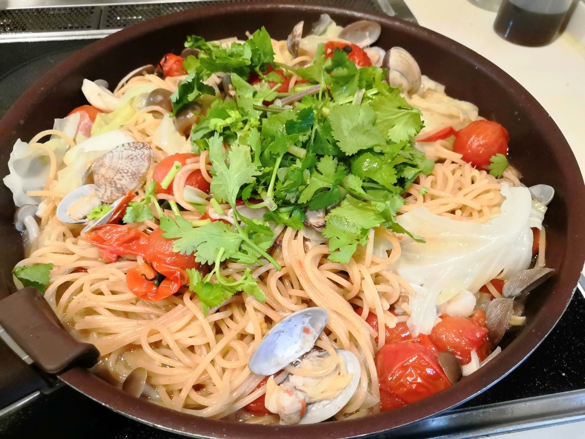 フライパンに水、あさり、アンチョビ、全粒粉パスタ、キャベツ、シメジ、ミニトマトいれて強火で加熱。
