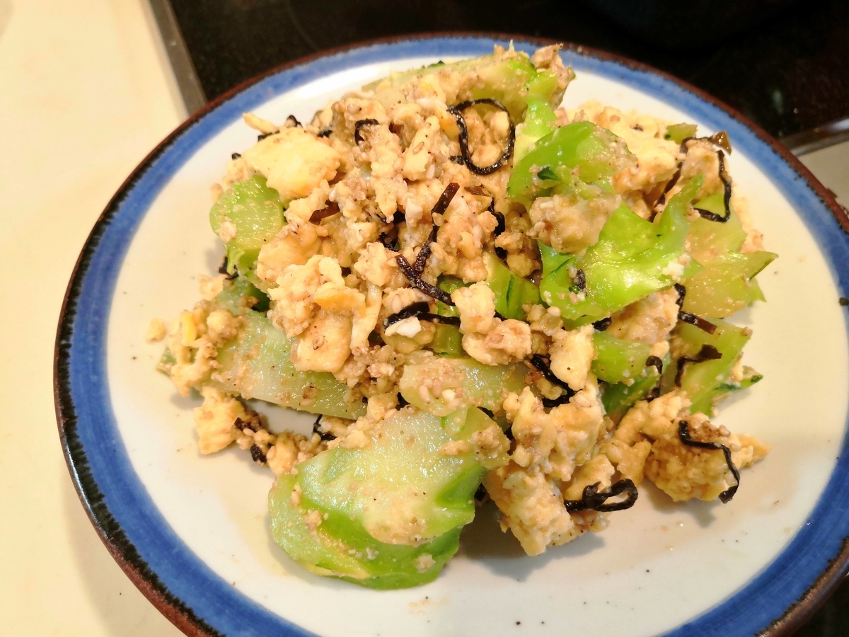 ブロッコリー、本体より茎が大好きです。今回は炒り卵と塩昆布などを和えたタンパク質もたっぷり栄養豊富な一品をご紹介。